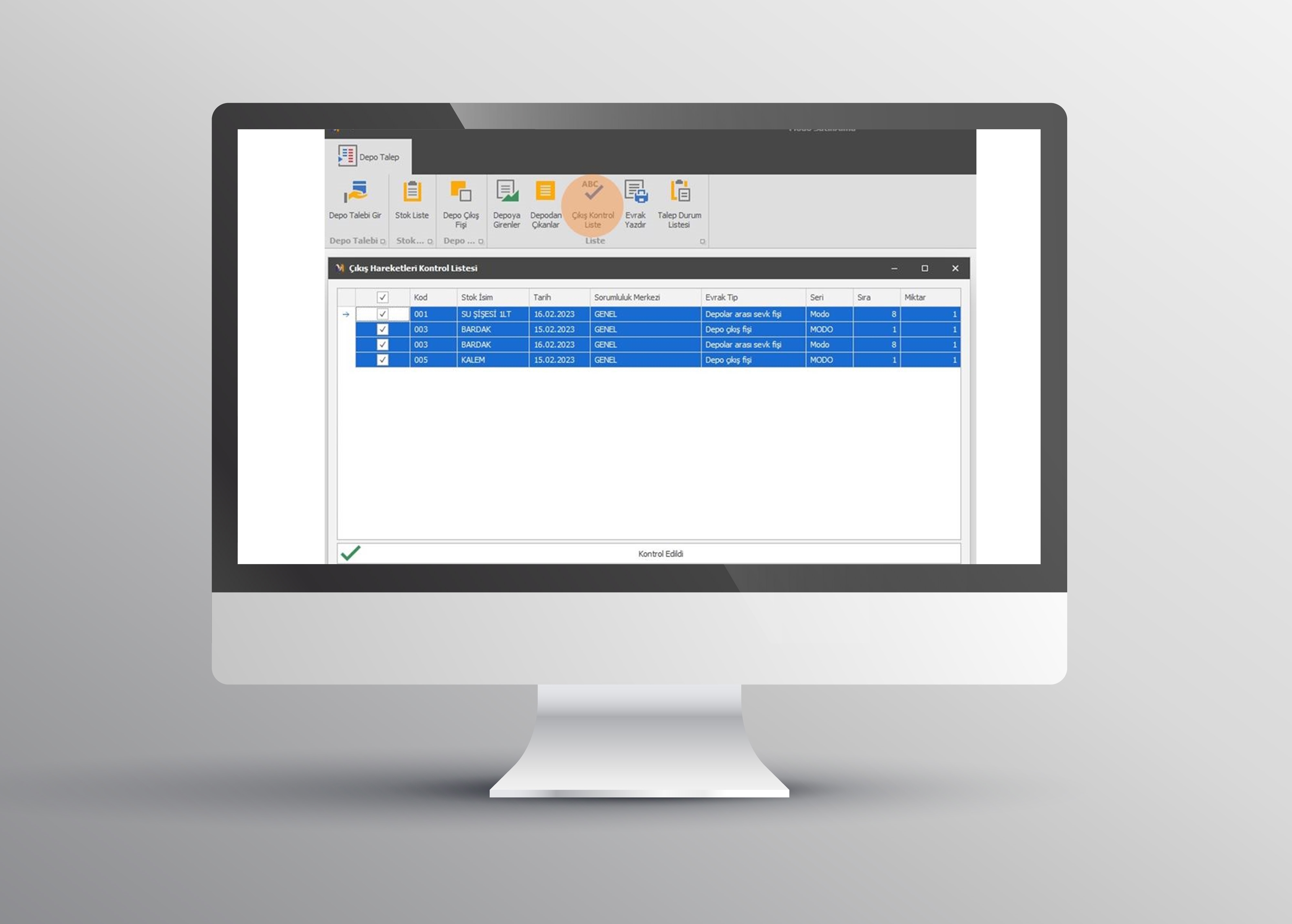 “Çıkış Kontrol Liste” menüsünden bölge şefleri depolarından çıkan ürünleri görüp, kontrol eder.