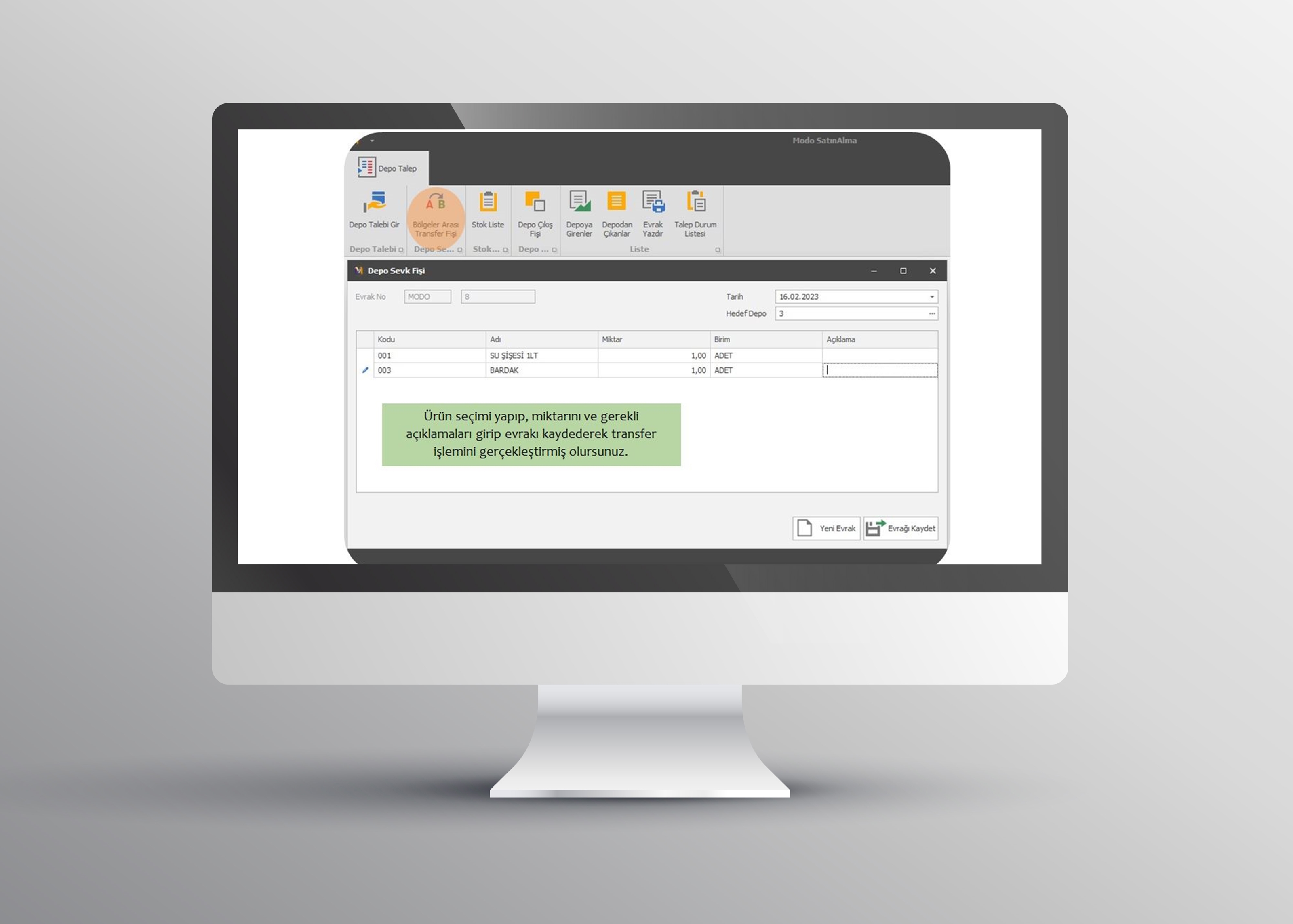 - “Depolar Arası Transfer Fişi” menüsü ile kullanıcı kendi deposundaki stokları başka depolara gönderebilir.