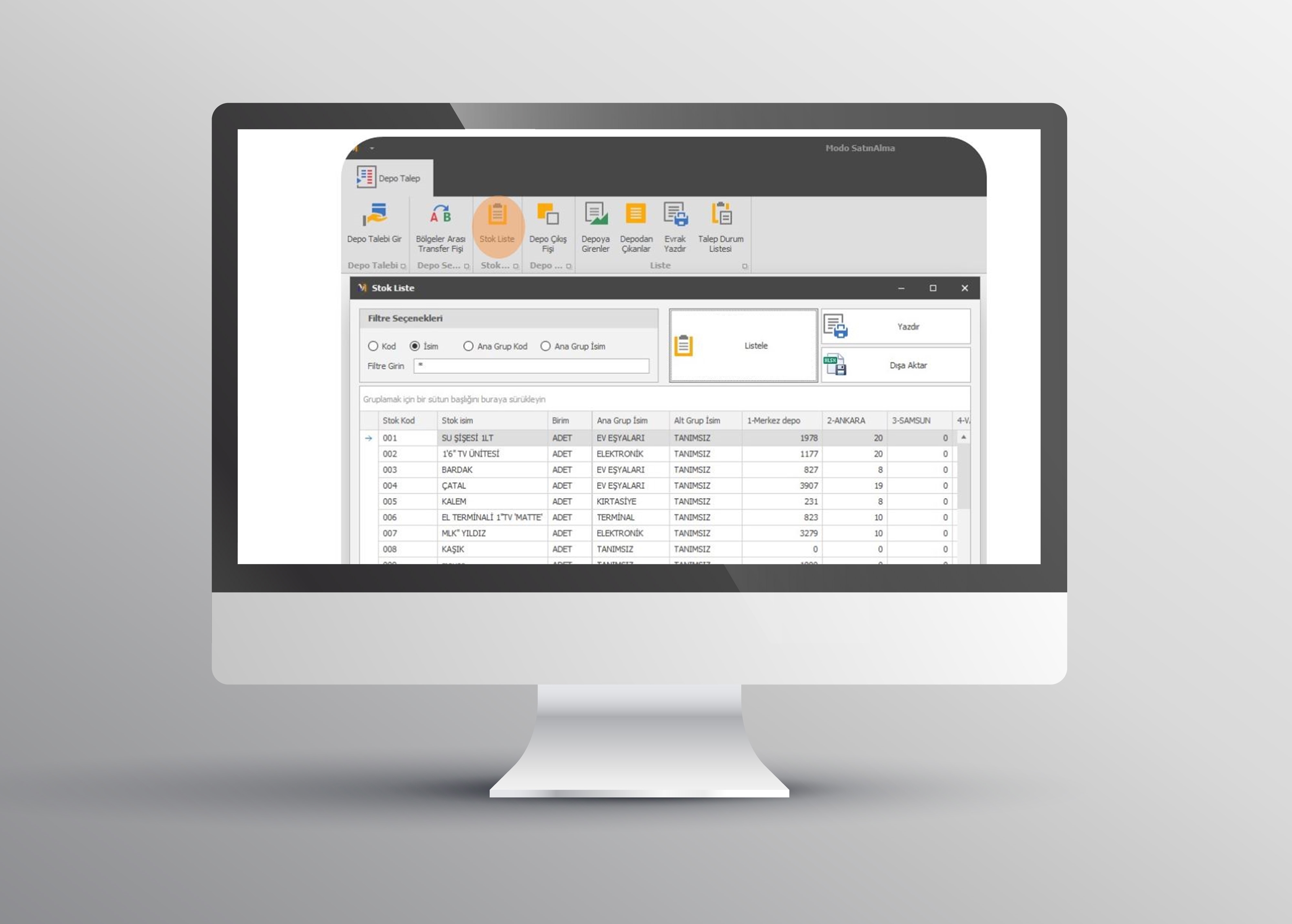 “Stok Liste” alanı sayesinde depolardaki ürün miktarları görülebilir.