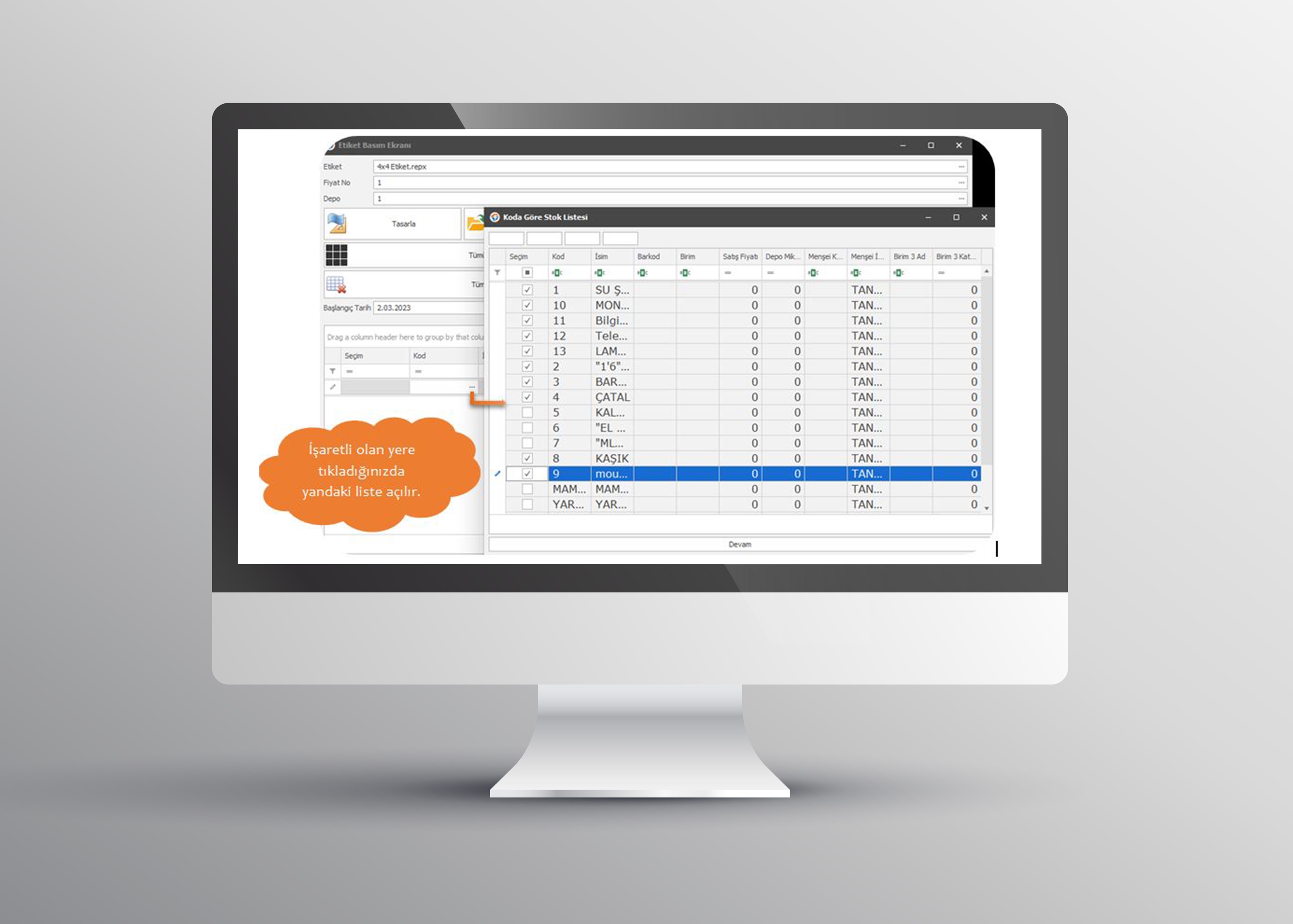 - Stoklarınızı toplu bir şekilde seçip etiket bastırabilirsiniz.