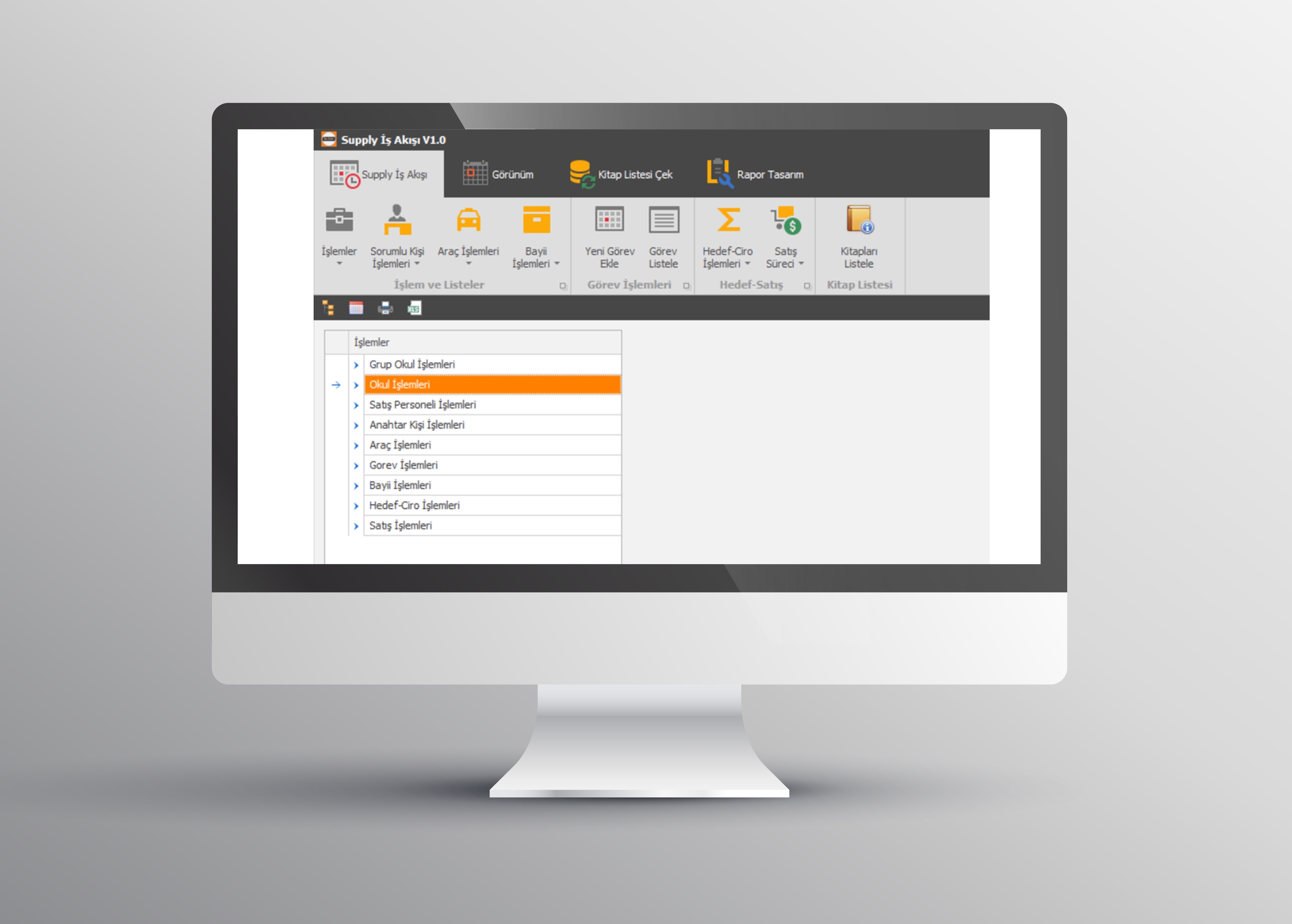 Supply İş Akışı, yerli veya yabancı dil eğitim ve öğretim kitap ve materyalleri alanında etkin olarak hizmet veren kitapçı, yayınevi ve dağıtımcı firmaların iş akış süreçlerine dair her konuda ihtiyaçlara cevap verebilecek düzeyde hazırlanmış bir otomasyon yazılımıdır. Supply İş Akışı, firmaların bilgisayar ile iş akışlarını görebilmesini, raporlar alabilmesini, satış, ciro ve hedef süreçlerini takip edebilmesini , veri dökümleri yapabilmesini kolay ve hızlı bir şekilde sağlayarak kullanıcıya iş akışı üzerinde kontrol ve zaman kazandırır. Ayrıca yazılımı etkin olarak kullanan firma için bütün iş süreçlerinde bir düzen ve standart elde edilmiş olunur.